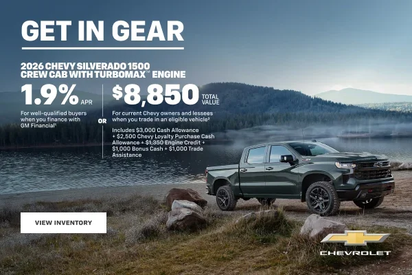 1. Length of contract limited. Must finance with GM Financial. Not available with lease and some other offers. Take new retail delivery by 3/2/26. 2. Available on the TurboMax™ engine only. Must trade in a 2012 model year or newer vehicle. Must show proof of current lease of a 2021 model year or newer Chevy vehicle or be a current owner of a 2012 model year or newer Chevy vehicle for at least 30 days prior to the new vehicle sale. Not available with lease and some other offers. Residency restrictions apply. Take new retail delivery by 3/2/26.