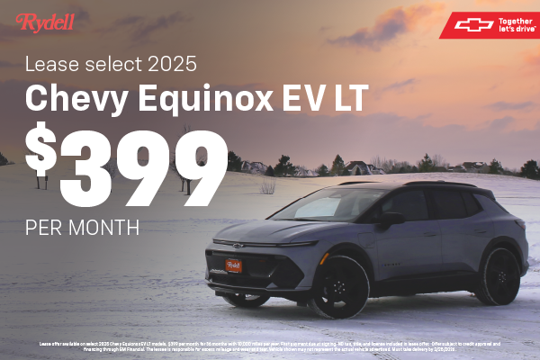 Lease offer available on select 2025 Chevy Equionox EV LT models. $399 per month for 36 months with 10,000 miles per year. First payment due at signing. ND tax, title, and license included in lease offer. Offer subject to credit approval and financing through GM Financial. The lessee is responsible for excess mileage and wear and tear. Vehicle shown may not represent the actual vehicle advertised. Must take delivery by 2/28/2026.