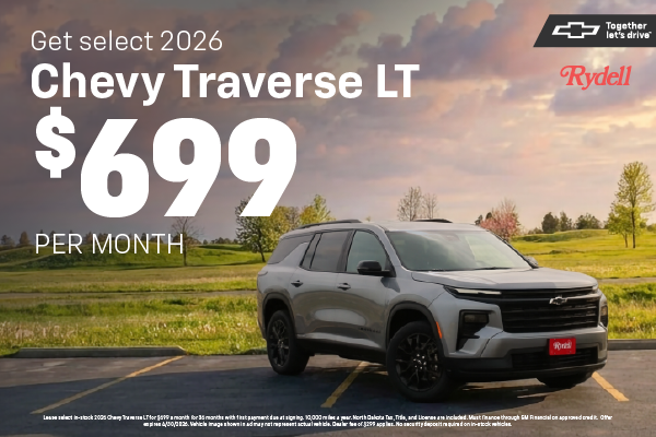 Lease select in-stock 2026 Chevy Traverse LT for $699 a month for 36 months with first payment due at signing. 10,000 miles a year. North Dakota Tax, Title, and License are included. Must finance through GM Financial on approved credit. Offer expires 4/30/2026. Vehicle image shown in ad may not represent actual vehicle. Dealer fee of $299 applies. No security deposit required on in-stock vehicles.