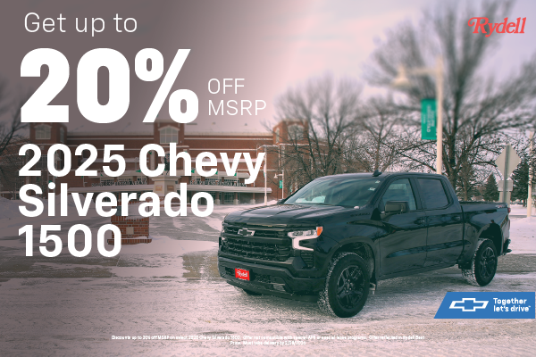 Discounts up to 20% off MSRP on select 2025 Chevy Silverado 1500. Offer not compatible with special APR or special lease programs. Offer reflected in Rydell Best Price. Must take delivery by 2/28/2026