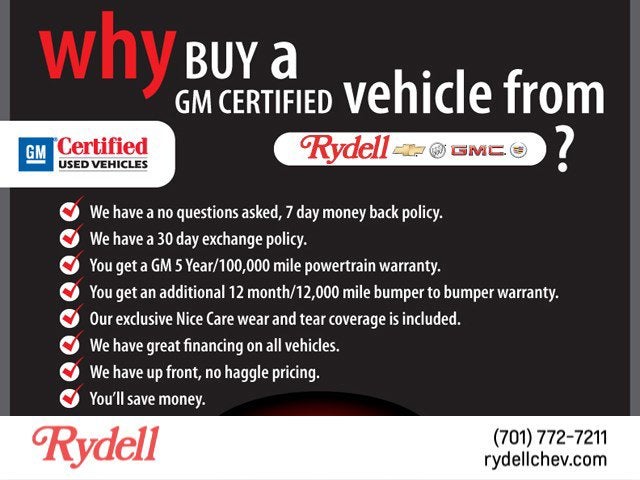 GM Certified Pre-Owned, 2-Year/30,000-Mile Standard CPO Maintenance Plan. 12-Month/12,000-Mile Bumper-to-Bumper Warranty. 5-Year/100,000-Mile Powertrain Limited Auto Warranty. 24/7 Roadside Assistance and Courtesy Transportation. 3-Day/150-Mile Customer Satisfaction Guarantee. 3-month trials of OnStar and SiriusXM Satellite Radio
